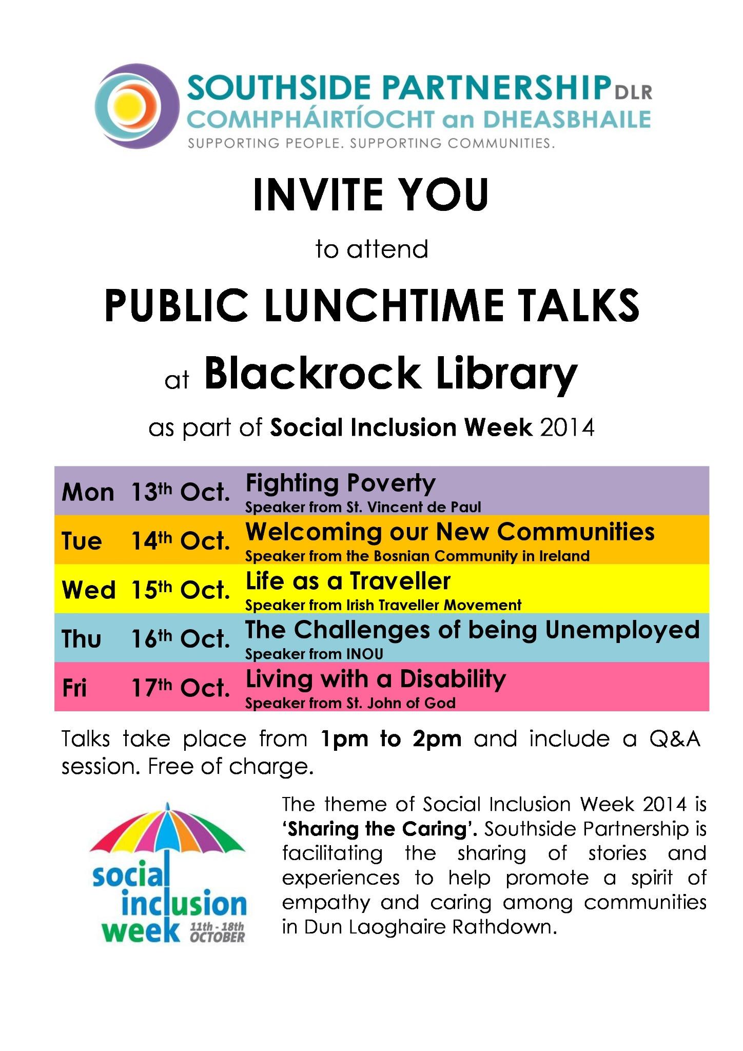 Southside Partnership are running a series of lunch time talks (1pm - 2pm) during Social Inclusion Week 2014 in Blackrock Library.